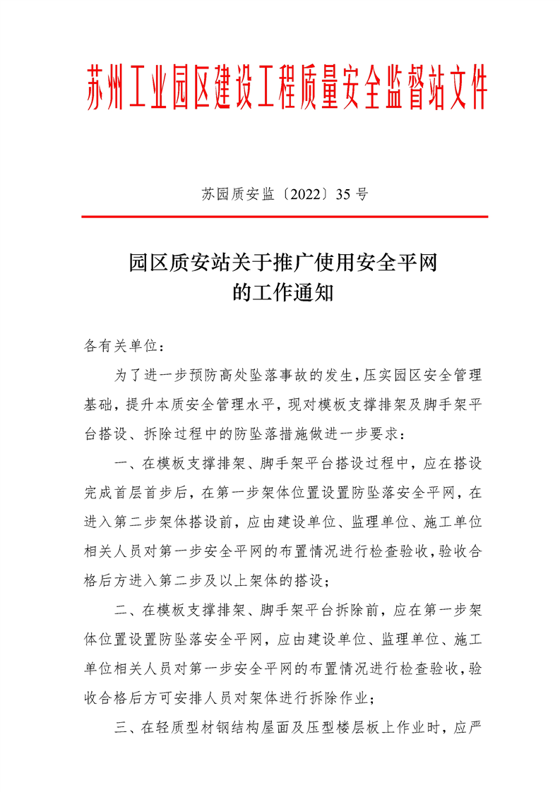 園區(qū)質(zhì)安站關(guān)于推廣使用安全平網(wǎng)的工作通知