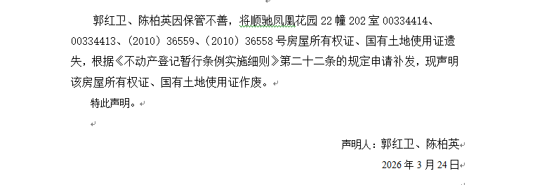 關于順馳鳳凰花園22幢202室00334414、00334413號房屋所有權證、(2010)36559、(2010)36558號國有土地使用證遺失聲明