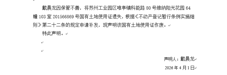 關于蘇州工業園區唯亭鎮科能路80號維納陽光花園64幢103室201566869號國有土地使用證遺失聲明