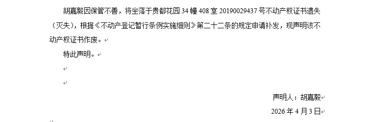 關(guān)于貴都花園34幢408室20190029437號不動產(chǎn)權(quán)證書遺失聲明