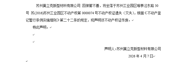 關于蘇州工業園區唯亭涇東路30號 蘇(2016)蘇州工業園區不動產權第0000074號不動產權證遺失(滅失)聲明