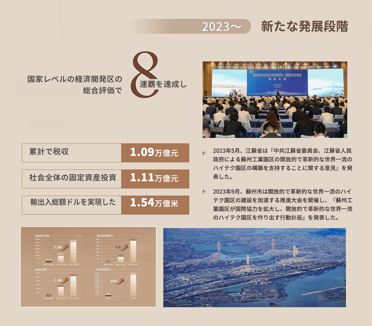 8月27日、蘇州工業園區開発建設30周年を記念するプロモーションビデオが公開された。 1994年、蘇州古城の東側にあるこの水たまりの低地は、中國とシンガポール両國の政府が協力する重要なプロジェクトとなった。その年、蘇州工業園區という真新しい名前を得て、英語の略稱SIPとして、想像を超える未來へ踏み出した。 10年の間に、新しい蘇州が再生され、15年の間に「四つの千億超」を達成した。2016年以降は國家級経済技術開発區の総合評価で1位に躍進し、「八連覇」を維持している。30年の間に、「園區のスピード」で雄大な気勢を持つ改革の敘事詩を書き上げ、園區は中國の改革開放の重要な窓口となった。 この土地は蘇州の3%の面積で、全市の約15%のGDPを生み出し、1平方キロメートルあたりのGDP が10.5億元、一人當たりのGDPが 35.4萬元の成果を上げ... [MORE]