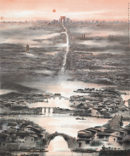 楊明義是蘇州籍畫家,他在80歲高齡創作的水墨作品《今日蘇州人間天堂》在此次展覽中亮相。該作品由近及遠,描繪出蘇州古今不同的時代風貌——既有小橋流水、古塔園林,也有蘇州工業園區的繁華盛景,體現了江南水鄉的發展變遷。“我去過新加坡,也因為藝術的淵源,對新加坡有著深厚的感情。藝術需要交流,通過一次次互動,相信未來中新文化合作必將結出更加豐碩的成果。”楊明義說。