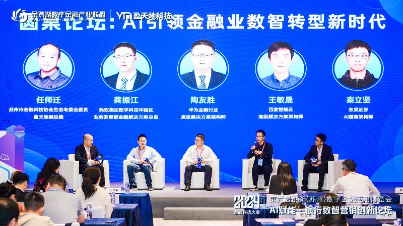 本次論壇還就《AI引領金融業(yè)數(shù)智轉型新時代》主題展開圓桌對話,深度探討數(shù)字化浪潮下AI大模型在金融行業(yè)的應用與挑戰(zhàn),并針對當下金融機構數(shù)字轉型過程中普遍存在的問題給出建議。圓桌對話邀請?zhí)K州市金融科技協(xié)會生態(tài)專委會委員、盈天地副總裁任師遷作為主持,螞蟻集團數(shù)字科技中國區(qū)業(yè)務發(fā)展部金融解決方案總監(jiān)龔振江、華為金融行業(yè)高級解決方案架構師陶友勝、百度智能云高級解決方案架構師王敏晟、東吳證券AI首席架構師秦立堅4位GenAI大模型的應用下的不同角度分析探討金融數(shù)字化發(fā)展機遇。