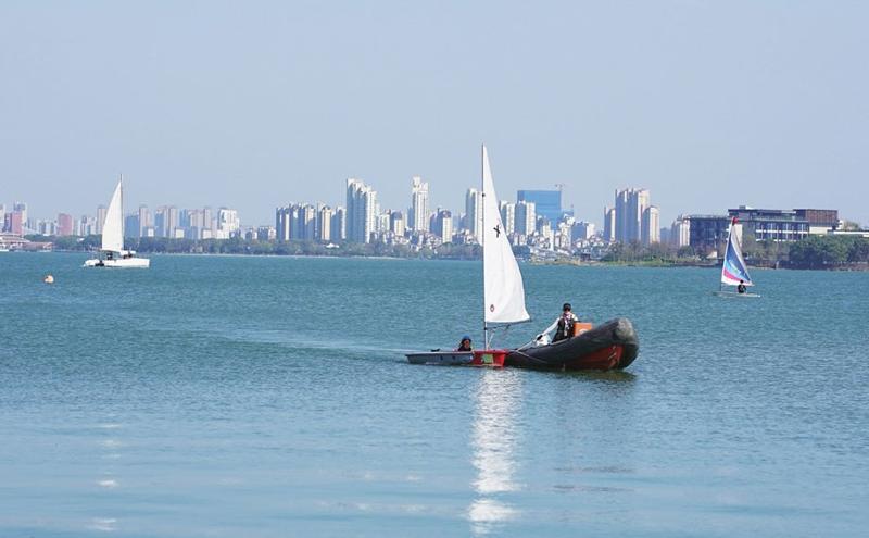 昨日,園區(qū)金雞湖春風(fēng)和煦,水上運(yùn)動(dòng)項(xiàng)目熱度大增。在風(fēng)之園碼頭附近水域,皮劃艇劃過(guò)碧藍(lán)的湖面。