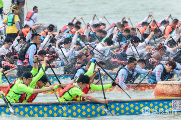 金雞湖上,一艘艘龍舟上演百龍爭渡,龍舟隊員們齊心協力、揮槳如飛,向著終點全力沖刺。現場,既有專業隊伍的速度與激情,也有國際友人解鎖“龍舟新姿勢”,彰顯著“龍舟精神”的多元魅力。如今,金雞湖端午龍舟賽已經成為蘇州的新民俗,吸引了眾多的市民和游客前來觀賽,為自己喜愛的隊伍加油助威。