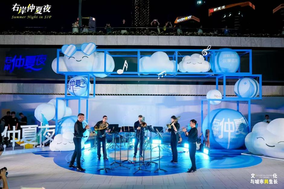 7月5日晚,金雞湖右岸客廳下沉廣場燈光璀璨,晚風(fēng)習(xí)習(xí),由園區(qū)打造的“右岸仲夏夜”首場演出在此活力上演。當(dāng)晚的舞臺猶如一幅流動的藝術(shù)畫卷,銅管的國際和鳴、少年舞團(tuán)的朝氣蓬勃、年輕樂隊的真摯表達(dá)、搖擺舞者的跨界活力——四個團(tuán)隊,四種截然不同的藝術(shù)語言,打破了傳統(tǒng)舞臺的邊界,在開闊的右岸空間里,共同譜寫出城市文化活力的交響樂章。