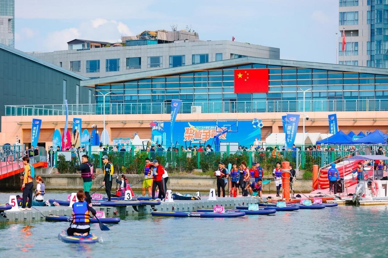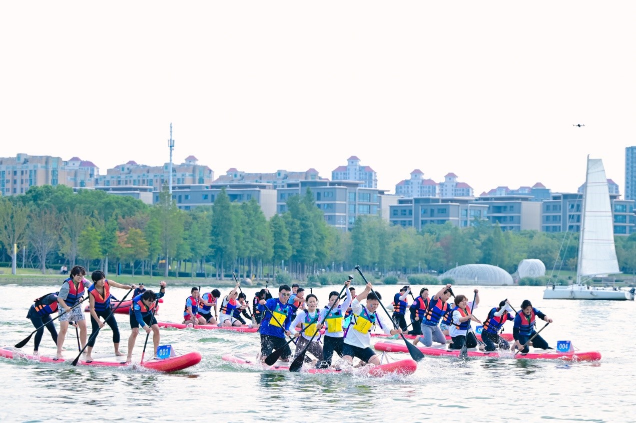 “今天天氣條件很好,湖面平靜,非常適合槳板運動。”來自西交利物浦大學(xué)代表隊的隊員表示,隊伍平時會開展平衡性訓(xùn)練、直線劃行等練習(xí),希望能在這場比賽中發(fā)揮出最好水平。值得一提的是,聚焦科教創(chuàng)新區(qū)特色,來自園區(qū)各科研院所的十余位領(lǐng)軍人才組成代表隊,從實驗室走向水域賽場,展現(xiàn)出科研工作者別樣的活力與風(fēng)采。“雖然剛開始接觸這項運動,但槳板運動帶來的與自然融合的體驗讓人感到非常舒適,期待以賽會友,在競逐中促進(jìn)交流學(xué)習(xí)。”園區(qū)科研院所領(lǐng)軍人才代表隊隊員程功弼說道。
