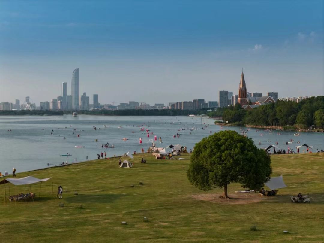 傍晚的獨(dú)墅湖,完美地承接了從書齋到生活、從思考到抒情的過渡。當(dāng)夕陽的余暉將獨(dú)墅湖染成一片溫暖的橙紅,人們不約而同地走向那個(gè)著名的文化地標(biāo)——“一棵樹”。它或許平凡,但在獨(dú)墅湖畔,它已成為一種精神象征,承載著年輕人的浪漫、友誼與對(duì)美好生活的向往。假期里,這里也成為露營(yíng)勝地,歡聲笑語不斷。