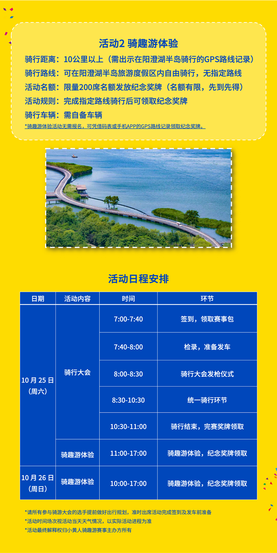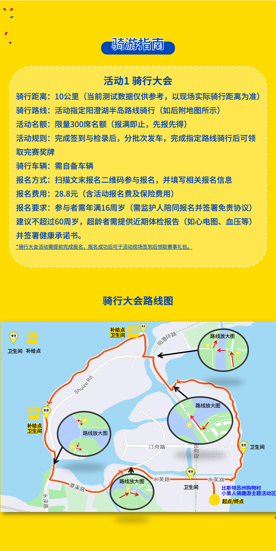 此次活動(dòng)分為騎行大會(huì)、騎趣游體驗(yàn)兩種形式,騎行大會(huì)需自備車輛、按照指定路線騎行,騎行距離約為10公里,參與者需年滿16周歲,完成指定路線騎行后可領(lǐng)取完賽獎(jiǎng)牌,報(bào)名費(fèi)用為28.8元;騎趣游體驗(yàn)也需自備車輛,可在陽(yáng)澄湖半島旅游度假區(qū)內(nèi)自由騎行,騎行距離為10公里以上(需出示在陽(yáng)澄湖半島騎行的GPS路線記錄),完成騎行后可獲得紀(jì)念獎(jiǎng)牌(限量200席名額),該項(xiàng)活動(dòng)無(wú)需報(bào)名,可憑借碼表或手機(jī)APP的GPS路線記錄領(lǐng)取紀(jì)念獎(jiǎng)牌。