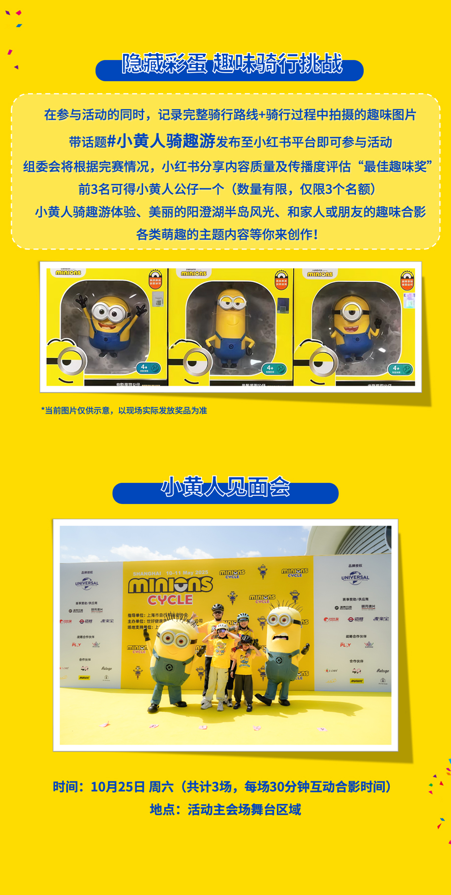 此外,在參與活動(dòng)的同時(shí),記錄完整騎行路線+騎行過程中拍攝的趣味圖片,帶話題#小黃人騎趣游發(fā)布至小紅書平臺(tái)還可參與“隱藏彩蛋趣味騎行挑戰(zhàn)”活動(dòng),后續(xù)活動(dòng)主辦方將根據(jù)完賽情況、小紅書分享內(nèi)容質(zhì)量及傳播度評(píng)估“最佳趣味獎(jiǎng)”,前3名可獲得小黃人公仔一個(gè)。