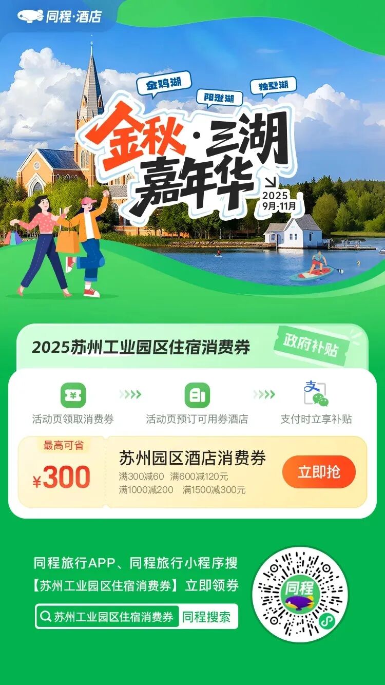 此外,金雞湖畔的W酒店、凱悅、尼依格羅,以及陽澄湖畔的英迪格、老北門柏漾、瀾庭等18家園區酒店,還推出低于8折的特惠套餐,覆蓋帶寵出游、情侶約會、下午茶、時令品鮮等多元場景,讓舒適棲居與實惠兼得。