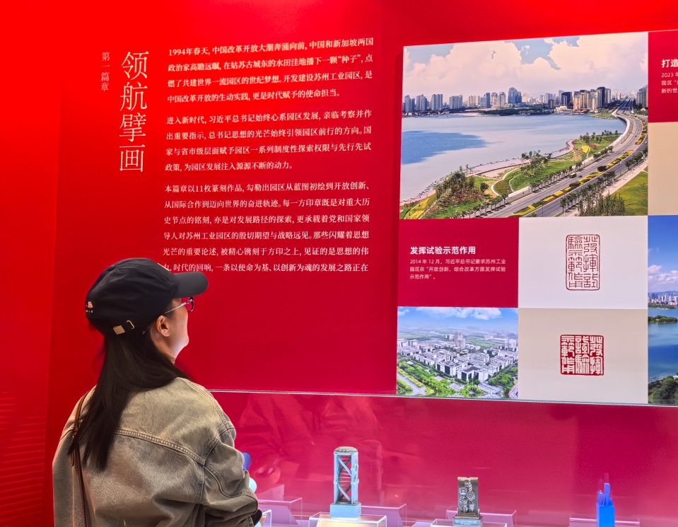 本次展覽以篆刻藝術為獨特載體,生動展現蘇州工業園區從“姑蘇城東、水田洼地”到“創新之城、非凡園區”的驚艷蝶變,展示園區積極探索開放與創新融合、創新與產業融合、產業與城市融合的發展之路。為廣大市民與文化愛好者呈現了一場沉浸式藝術盛宴。