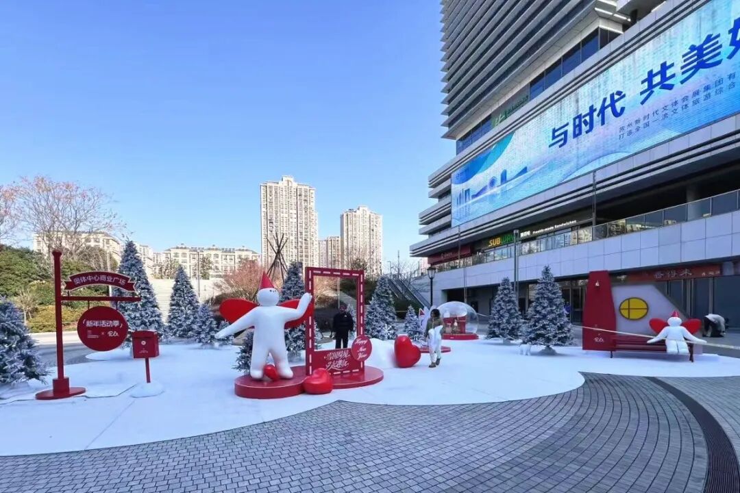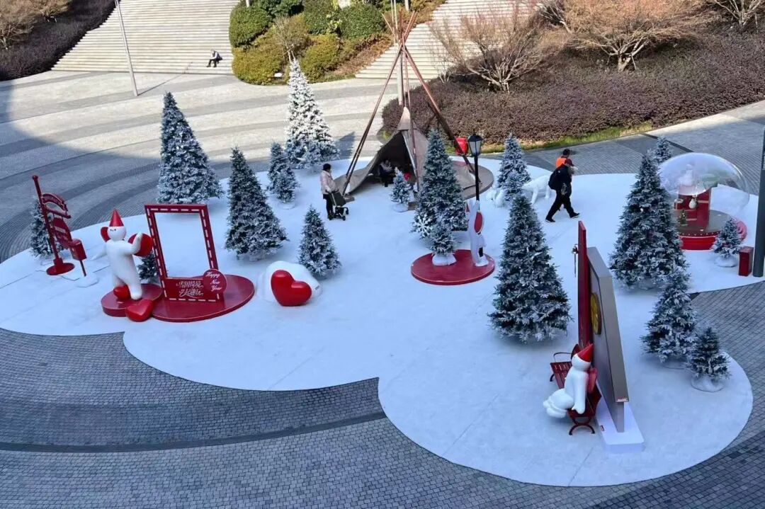 在蘇州奧體中心商業(yè)廣場,頭戴紅色尖角帽的軟萌撲拉PULA帶著對雪國的全部想象,將這里裝點(diǎn)成夢幻之地。鋪著仿真雪的空間里,霧凇燈串營造出冬日的松弛感,巨型水晶球裝置裝滿禮物和小雪人,雪屋休憩區(qū)和專屬打卡框則為市民游客與PULA合影留出足夠空間。