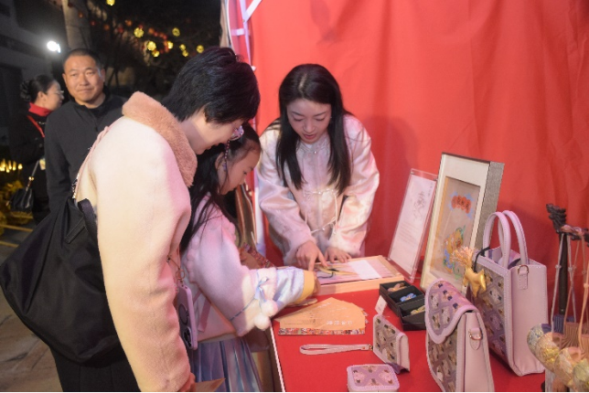 在仁和織繡的攤位前,來自北京的沈女士正帶著女兒一起體驗。沈女士的女兒在學習京劇,特別喜歡傳統文化和非遺?!拔覀冎霸诓┪镳^見過緙絲,但不了解具體工藝?,F場準備了緙絲小教具,我們可以親自動手體驗,看著一根根絲線最終形成畫面,特別有成就感。”對于緙絲體驗,沈女士頻頻點贊。