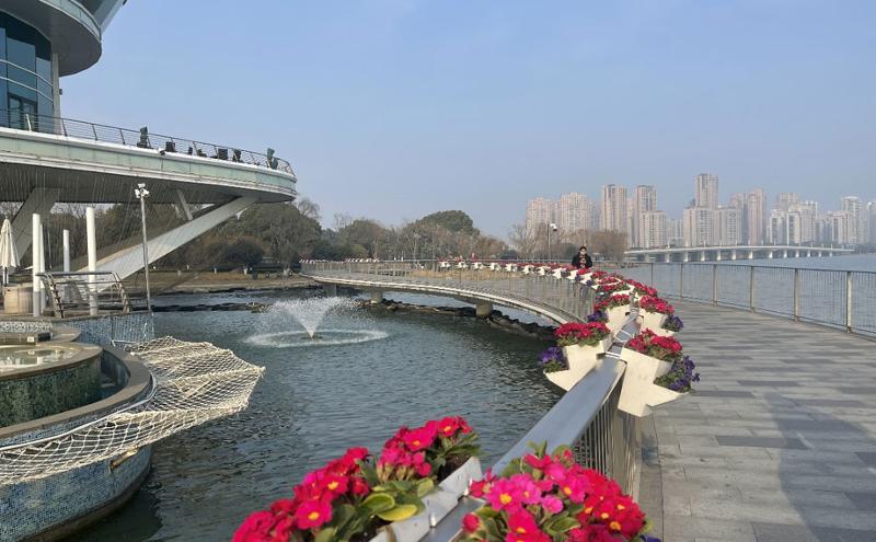 各色的角堇花箱呈陣列式間隔擺放,勾勒出城市彩色線條,用熱鬧喜慶的花卉美景點亮新春環境,拉滿春節氛圍感。