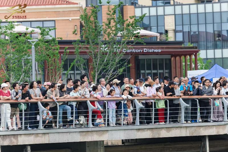 隨著比賽正式開始,金雞湖上百龍爭渡,龍舟隊(duì)員們齊心協(xié)力、揮槳如飛,向著終點(diǎn)全力沖刺。岸邊的觀眾也被熱烈的氛圍點(diǎn)燃,歡呼聲和加油聲一浪高過一浪。