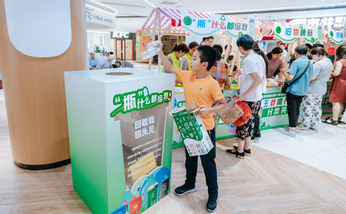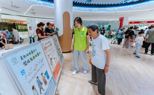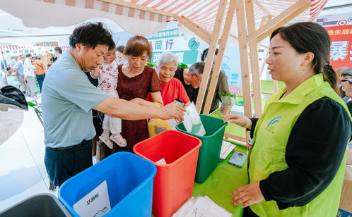 趣味游戲區(qū)的創(chuàng)意設(shè)計亮點(diǎn)頻出。居民們手持打卡地圖,穿梭于“垃分視力表”“分類大轉(zhuǎn)盤”“綠色補(bǔ)給站”等八大互動點(diǎn)位,通過趣味測試、知識問答、投擲游戲等方式邊玩邊學(xué)。“‘瓶’什么都給我”專區(qū)人氣爆棚,居民王阿姨用積攢的飲料瓶兌換了綠蘿,笑得合不攏嘴。“城投再生”“綠色補(bǔ)給站”和“舊物煥新”專區(qū)也深受居民青睞,居民們拎著紙箱、舊衣物排隊(duì)兌換環(huán)保袋、文具等實(shí)用物品,直觀感受到“垃圾是放錯位置的資源”。游戲化體驗(yàn)不僅提升了垃圾分類知識的趣味性和互動性,更讓居民在輕松愉悅的氛圍中掌握分類技巧、提升環(huán)保意識。針對還不太熟悉如何正確分類的居民,志愿者則一對一講解垃圾分類知識,實(shí)現(xiàn)寓教于樂“零距離”。此外,志愿者們還同步宣傳倡導(dǎo)“光盤行動”“限塑”“減少使用一次性用品”等源頭減量、簡約適度的生活方式。