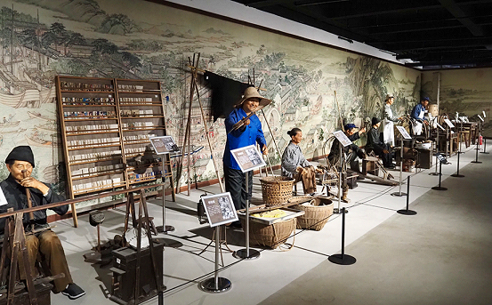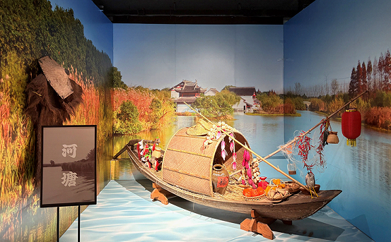 A specially designed Jiangnan water town scene, with a fishing boat, fishing tools, and embroidery, visually demonstrates the traditional “men farming and women weaving” lifestyle.