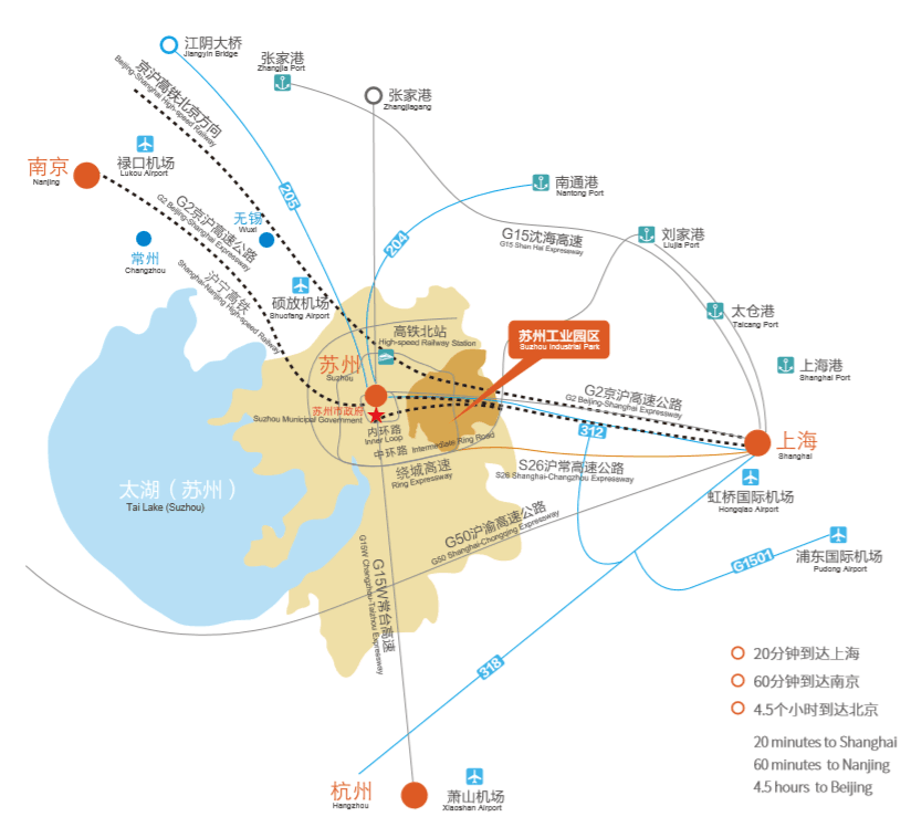 Located in eastern Suzhou, SIP boasts a network of expressways, railways, watercourses and air routes that link it with the major global cities. It takes only 20 min to Shanghai, 60 min to Nanjing, and four and a half hours to Beijing by railway. It is an important center in the Yangtze River Delta region for headquarters economy and commercial and cultural activities.