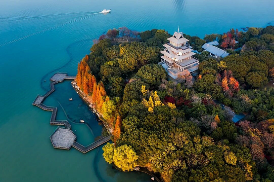 On the Taohua Island, the ring of colorful trees along the lake shore gives the island a warm hug. A bird’s-eye view is particularly stunning.