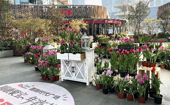 At the central square along Tianmu East and West Streets, diverse elegant blossoms including pure-white narcissus, golden double-petaled daffodils, sweet camellias, graceful phalaenopsis and colorful tulips drew crowds of passersby, who paused to admire the dazzling floral displays.