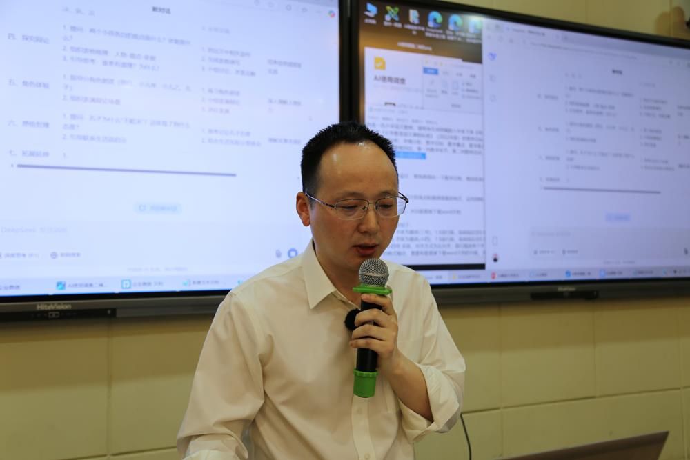 活動第三階段,星洲小學周學平老師帶來專題講座《AI賦能小學語文教學》。周老師潛心教育教學研究,專注信息化創新應用,兩個小時的講座以實踐為主,呈現了AI在語文課的課前、課中、課后等教學場景的應用:利用企業微信收集表設計問卷;備課中引入deepseek輔助并在強化邏輯、追問、細化中逐步完善;數字人的應用;互動小游戲等等,一系列可視化操作讓所有參與教師收獲滿滿。